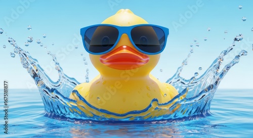 Cool rubber ducky with sunglasses enjoys a refreshing splash in the water on a sunny day