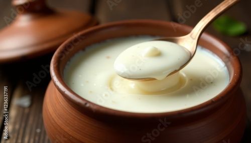 Copper spoon scooping creamy white dairy product from a traditional Indian earthenware pot, traditional Indian serving dish, copper utensil, yogurt