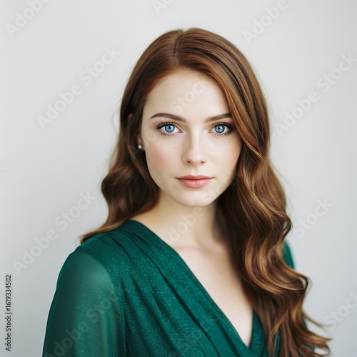 woman, girl, female, portrait, head shot, model, beauty, attractive, pretty, gorgeous, redhead, auburn, long hair, wavy hair, curl, make-up, eye, blue eye, skin, face, hair, elegant, fashion, style, shoulder, neckline, expression, serious