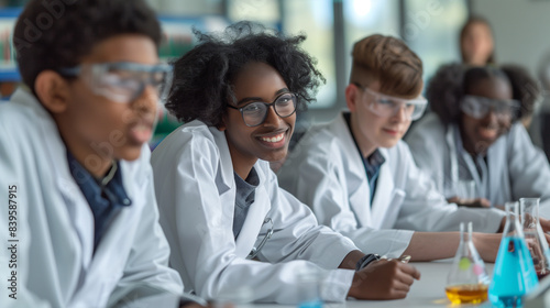 copy space, stockphoto, multiracial, high school students with labcoat in a analytic practice lab. Students different ethnic background in an chemistry lab. School theme mockup.