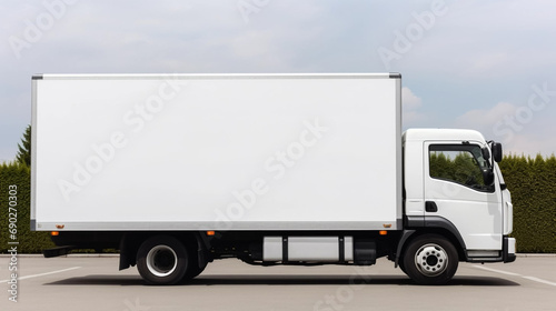 copy space, stockphoto,white delivery truck side view cargo truck advertising. Side view of a big white truck standing in the street. Copy space available. Template for transportation company. Transpo