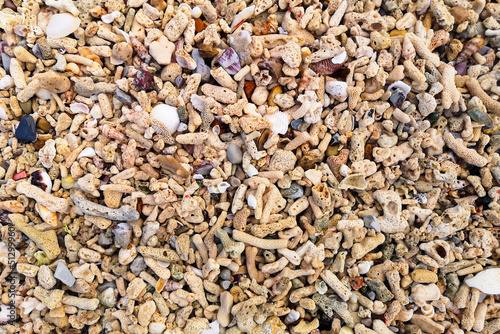 Coral fragments and shells at the seashore
