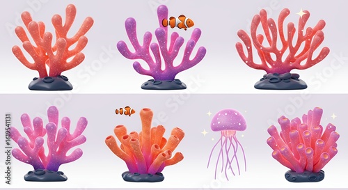 coral, reef, marin, underwater, fish, clownfish, jellyfish, ocean, coral reef, illustration, graphic, design, digital, pink, orange, red, ocean life, nature, environment, sea, animated, cartoon, vector, isolated, graphic design, colourful, texture, education, children, design element