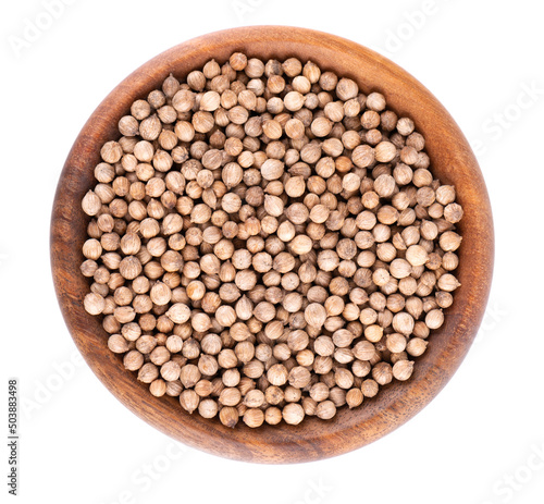 Coriander seeds in wooden bowl, isolated on white background. Cilantro grain. Organic spice. Top view.