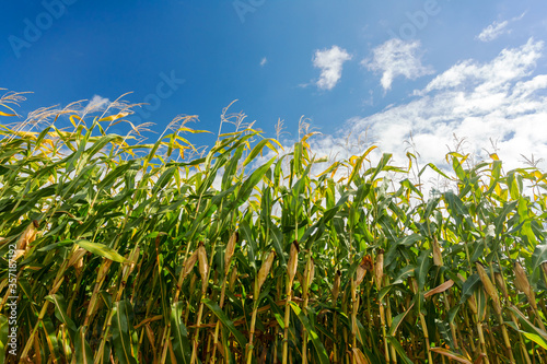 corn, field, maize, farm, farming, sweet, organic, plant, white, yellow, growth, land, harvest, closeup, grain, produce, nobody, natural, grow, agriculture, green, cloud, row, leaf, growing, bright, crop, summer, cob, countryside, vegetable, sweet corn, season, healthy, seed, blue, rural, outdoors, sky, country, gold, scene, background, fresh, health, nature, environment, food, landscape, cereal