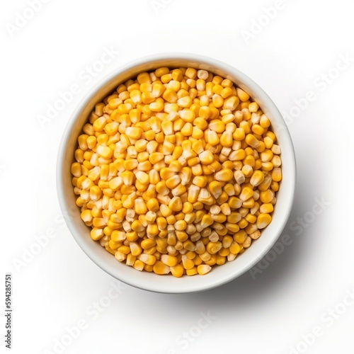 Corn grain on white bowl, isolated on white background. Top view. Ingredient, recipe, food.