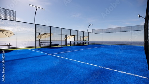 Corner view Floating Padel Court with bench and shade on ocean 3d rendering