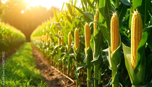 cornfield, sunset, crop, agriculture, harvest, gold, field, row, plant, stalk, green, yellow, nature, outdoors, sunlight, summer, farmland, rural, landscape, vibrant, growing, fertile, healthy, abundant, productive, detail, close, view, ripe, leaf, dirtied, fresh, organic, farming