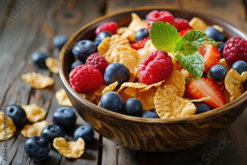 fruit, corn, bowl, raspberry, blueberry, healthy breakfast, cornflake, color image, freshness, healthy eating, raspberry, breakfast, granola, food, berry fruit, lifestyle, healthy lifestyle, morning, vegetarian food, blueberry, food and drink, meal, closeup, cornflake, background, indoor, merchandise, photo, horizontal, no people, fiber, indulgence, milk, yogurt, crunchy, juicy, muesli, oatmeal, ready-to-eat, spoon, sweet food, berry, organic, ripe, snack, table, generative