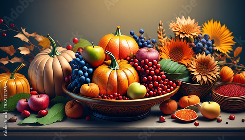 autumn, harvest, fruit, flower, pumpkin, grape, apple, sunflower, cornucopia, abundance, fall, season, still life, table, decoration, festive, celebration, nature, ripe, colourful, orange, red, yellow, thanksgiving