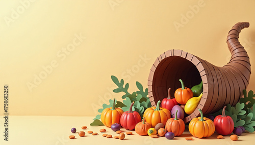 Cornucopia with pumpkins and leaves on yellow background for Thanksgiving cards, Autumn event invitations, harvest festival banners and fall season promotions