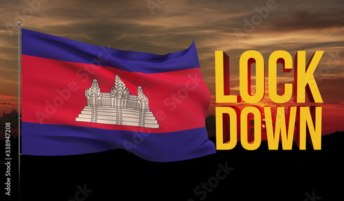 Coronavirus COVID-19 lockdown concept with waving national flag of Cambodia. Pandemic 3D illustration.