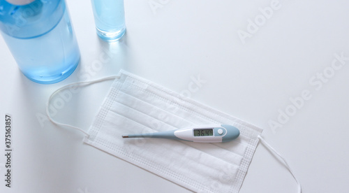 Coronavirus protection Face masks thermometer hand sanitizer bottle. Hygiene and Health care for stop spreading outbreak coronavirus covid 19.