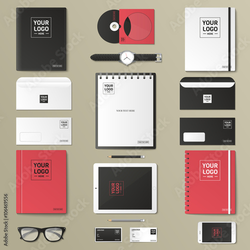 Corporate identity template set. Business stationery mock-up with logo. Branding design. Notebook, card, catalog, pen, pencil, badge, tablet pc, mobile phone, letterhead.