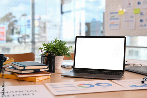Corporate office interior, laptop computer, financial document and books on wooden table