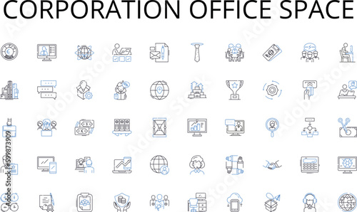Corporation office space line icons collection. Machine, Fabrication, Parts, Manufacturing, Engineering, Construction, Joining vector and linear illustration. Integration,Assembly line,Production