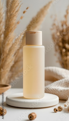 Cosmetic bottle on a white surface with decorative elements and a neutral background