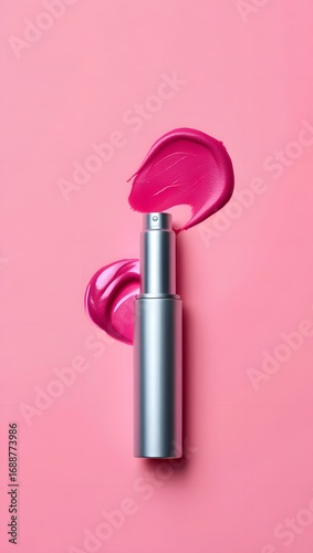 cosmetic, beauty, make-up, pink, product, smear, silver, lipstick, gloss, cream, lotion, skin, care, promotion, advertisement, minimal, modern, style, elegant, luxury, female, glamour, shiny, vibrant, colours, aesthetic, design, studio, shot, still life, vertical, background, metallic, tube, container, cosmetic