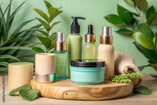 Cosmetic products and green leaves on green background. Natural organic cosmetics, healthy concept.