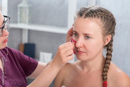 Cosmetologist sticks tapes on the girls face. Facelift. Tape for facelift with kinezio. Aesthetic patch for face.