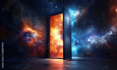 Cosmic doorway opening to vibrant galaxy with colorful nebulae and stars