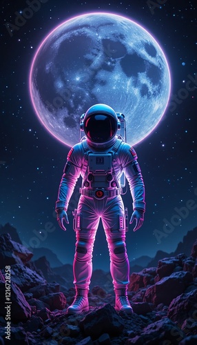 Cosmic Enigma: An astronaut stands tall on a lunar landscape, bathed in the ethereal glow of a giant, luminous moon. The astronaut's suit shimmers with otherworldly light.