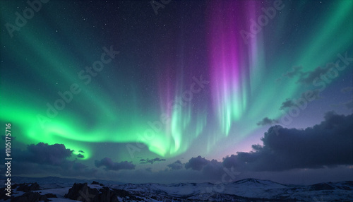 Cosmic Glow Background with Green and Purple Auroras on a Starry Sky