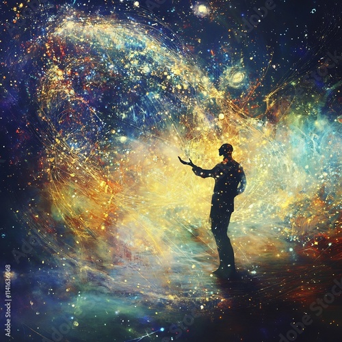 galaxy, universe, cosmos, star, cosmic, celestial, nebula, surreal, fantasy, imagination, mystical, atmospheric, energy, light, glow, silhouette, figure, human, man, person, digital, art, painting, creative, expression, space, sky, night, spirit, power, magic, dream, mystery, life events, transformation, discovery, connection, wonder, awe, creativity