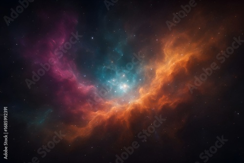Cosmic nebula cloud in deep space glowing with magenta, teal, and golden orange, bright star cluster at center with swirling gas patterns, stunning abstract space background