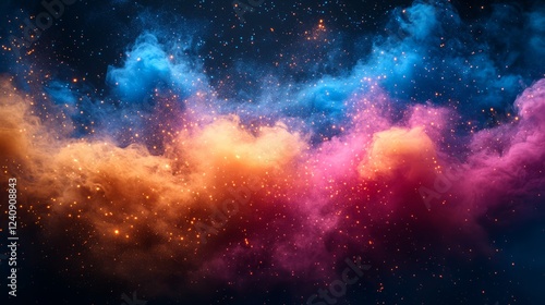 Cosmic Nebula, Vibrant Hues Of Blue, Orange, And Pink Smoke With Glowing Particles.