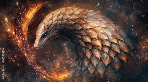 Cosmic Pangolin with Universes for Scales: Sacred Spirals in Fractal Patterns. High-Resolution Digital Background for Protective Energy and Spiritual Armor.