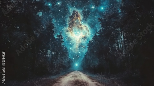 cosmic, path, forest, dark, night, star, galaxy, nebula, aethereal, mystical, road, tree, sky, space, dreaming, mystery, adventure, wonder, imagination, journey, magical, night time, serene, quiet, peaceful, beauty, amazing, stunning, immensity, deep, wide, open, foggy, distant, illuminated, glowing, colourful, vibrant, celestial, universe, nature, photo, digital, composite, landscape