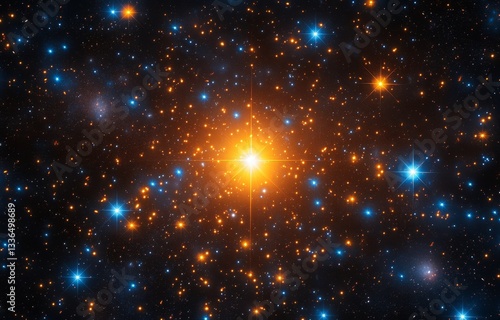 Cosmic Star Cluster. A vibrant, dazzling display of celestial bodies, with a brilliant central star surrounded by a multitude of smaller, sparkling stars in a rich, dark space