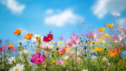 Cosmos flowers bloom in vibrant hues beneath a clear blue sky.
