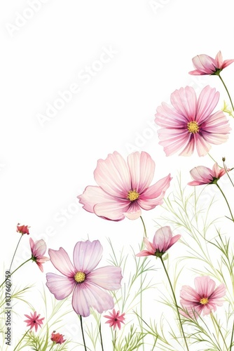 cosmos themed frame or border for photos and text. with delicate pink and white flowers. watercolor illustration, white color background.