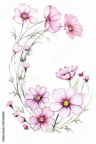 cosmos themed frame or border for photos and text. with delicate pink and white flowers. watercolor illustration, white color background.
