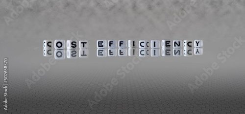 cost efficiency word or concept represented by black and white letter cubes on a grey horizon background stretching to infinity