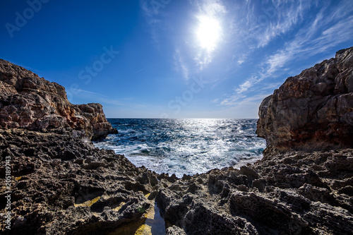 sea, ocean, beach, coast, water, landscape, rock, heaven, nature, blue, coastline, wave, seascape, cloud, bay, horizon, cliff, sun, majorca, dawn, island, rock, rocky, outdoors, shore