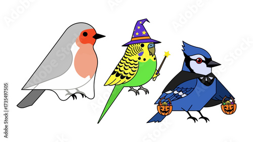 Costumed Avian Trio: Three whimsically illustrated birds in costumes. The ensemble includes a Robin Hood-inspired robin, a wizard budgie, and a bat-winged blue jay.