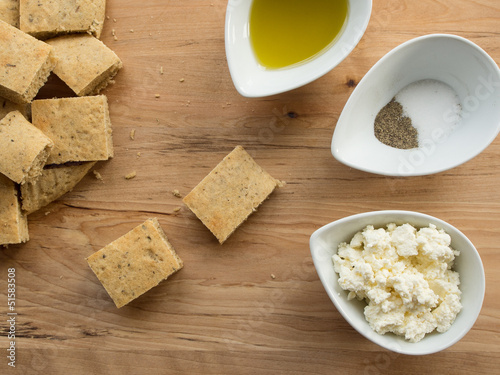 bowl, bread, cottage cheese, chopping board, edible, food, good, homemade, olive oil, pepper, salt, small