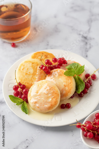 Cottage cheese pancakes, syrniki, ricotta fritters with fresh berries and sour cream and tea on white marble background close up. Healthy and delicious breakfast, high key
