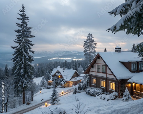 winter, snow, house, mountain, landscape, cold, cabin, christmas, nature, ski, forest, tree, alps, snowy, sky, bungalow, hotel, chalet, village, season, wooden, wood, holiday, white, alpine