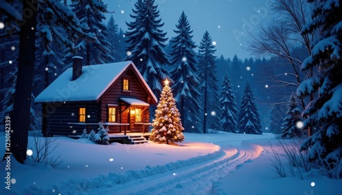 Cottage in the woods on a snowy evening with Christmas tree, evergreen trees, snow falling