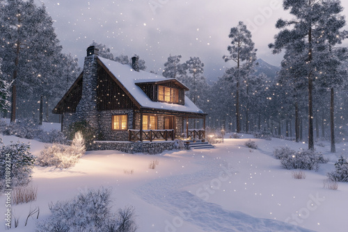 cottage with a warm glow inside the house. With a snowy landscape, mountain, and pine trees. Christmas winter evening scene. AI generated