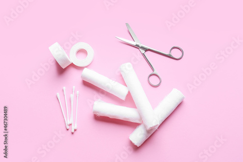 Cotton buds, medical plaster, surgical scissors and bandage rolls on color background