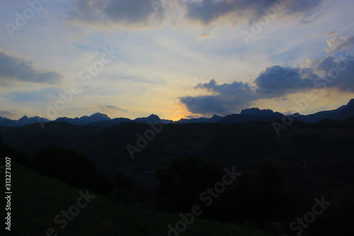 mountain, sunset, heaven, landscape, sunrise, nature, sun, cloud, blue, dusk, morning, hill, view, fog, evening, silhouette, dawn, beauty, light, horizon, orange, vale