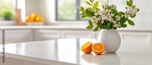 fruit, orange, flower, countertop, kitchen, home, fresh, white, still life, decor, plant, table, arrangement, vase, clean, healthy, delicious, closeup, bright, interior, house, food, decoration, blossom, floral, cut, halved, citrous, refreshing, domestic, minimal