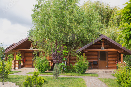 Country cottages with log and timber in the green area. cozy eco-friendly houses made of natural wood, bungalows for families