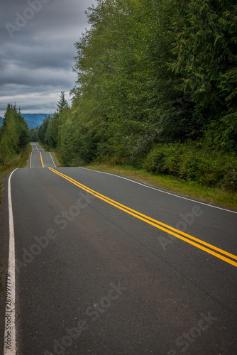 asphalt, curve, drive, forest, highway, hill, landscape, lane, line, ribbon, road, road, travel, yellow, countryside, paved, rural, gloomy, moody, storm, curved, quiet