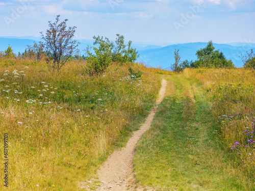country road on the top of a hill. mountainous countryside landscape on a sunny day in summertime. hiking through rural area